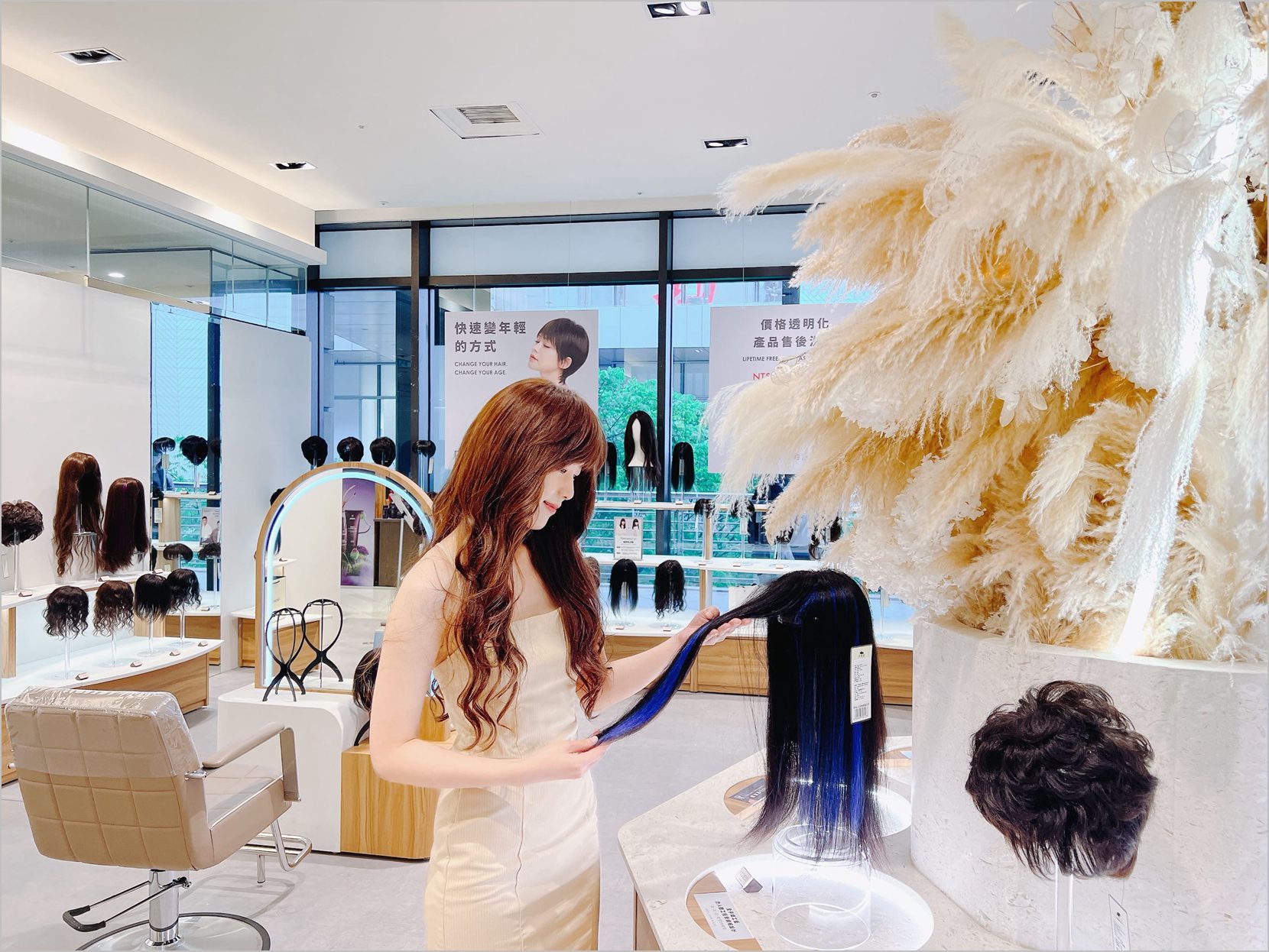 門市陳列多款造型髮套與髮片,售價依髮材與設計差異而有所不同,提供清楚標價,無額外加價。Rebecca 更領先業界,提供「終身免費洗護」服務,從試戴到日後保養流程皆公開透明,全面提升顧客體驗。
