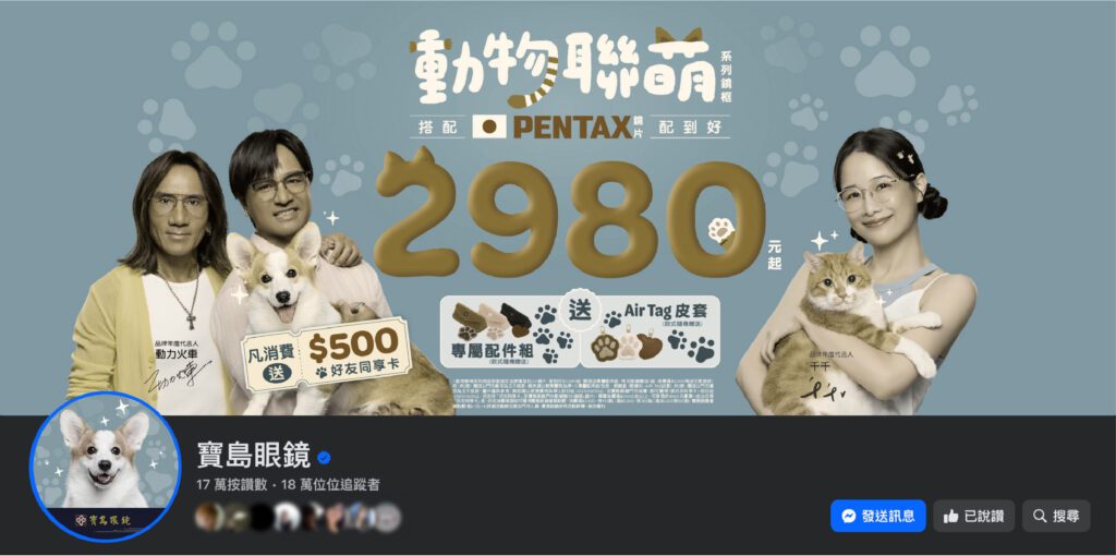 寶島眼鏡推出許多可愛動物鏡框,特別在這一天將品牌社群的顏色變成毛孩眼中的顏色,邀請螢幕前的人們換個視角看世界,不只看見牠們的可愛,也看見流浪動物的處境與需求。