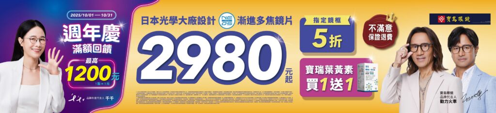 此外,2025/10/1至2025/10/31寶島眼鏡週年慶再加碼推出雙重優惠,全館單筆消費滿額最高可享1,200元(回饋點數可於寶島眼鏡APP週年慶活動頁面領取,1點可折抵1元,門市折抵無上限),同時還可搶領限量折價券,再享隱形眼鏡消費滿888元可現折100元,活動期間眾多優惠折上折,現在正是配多焦鏡片的最佳時機!