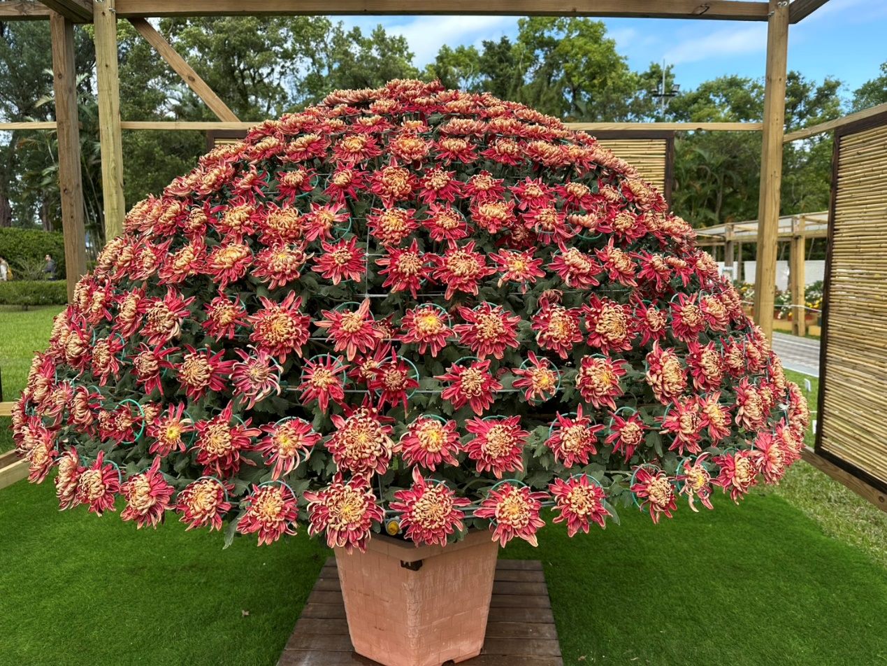 公園處藍舒凢處長表示,提到士林官邸菊展,許多花迷心中最不能錯過的亮點就是「大立菊」,這項被譽為「菊中之王」的園藝技藝,是由公園處苗圃同仁們歷年累積摘心、整枝牽引、花期調控、嫁接等經驗的成果。大立菊的誕生,是對植物科學與美學極致的挑戰,其傲然挺立的姿態與生命力,展現讓人驚艷的花景絕色,要能讓一株大立菊同時盛開上出百朵花,不只從多元的大菊品種選育出穩定高且枝條柔軟具有可塑性的品種菊,更是以難度程度更高的嫁接技術,讓單株大立菊能綻放出多種的繽紛色彩。