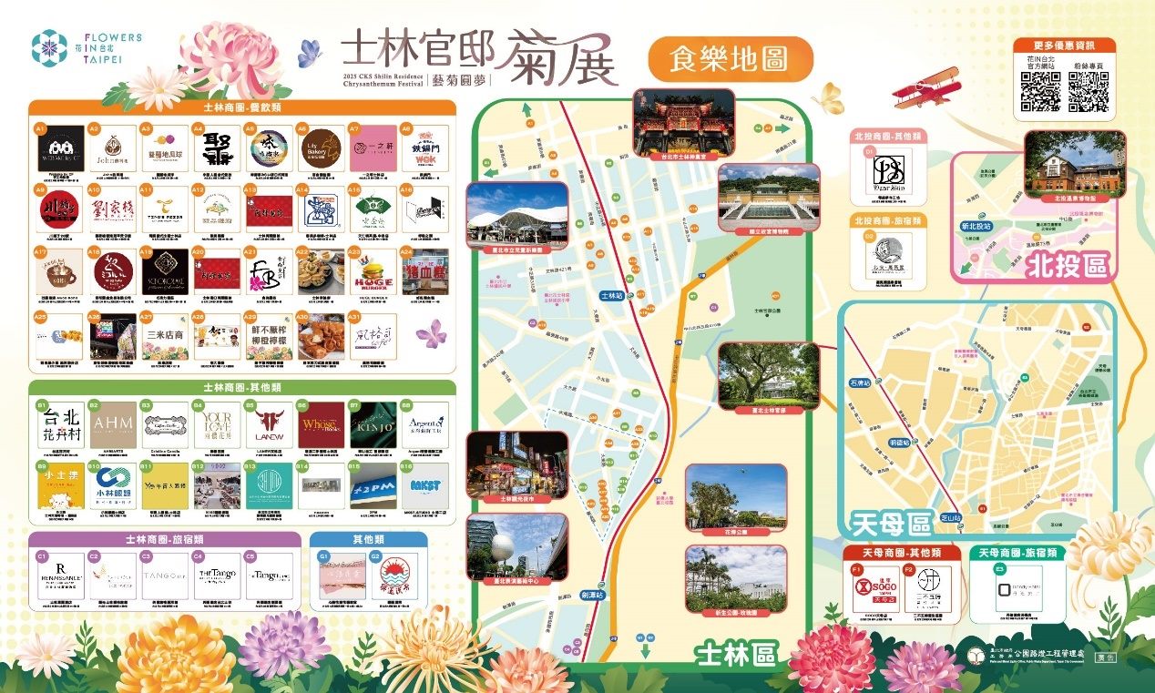 來到士林官邸賞花,建議大家能夠一同安排周邊景點行程,如到鄰近的士林夜市商圈享用美食、前往士林神農宮祈福、打卡以「夢想啟航」為概念設置的微型菊藝展區;或是逛逛串聯周邊超過60家特約商家,使用花展期間的專屬優惠,無論是來一碗士林小吃,還是帶一束菊花造型的文創小物回家,都讓賞花之旅更具人情味,不僅省了荷包又能夠感受到在地店家的風情。